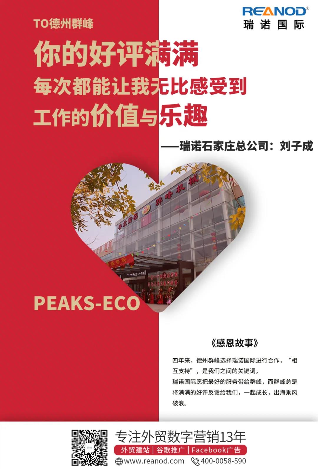 瑞(rui)诺國(guo)際(ji)把最好的(de)服務(wu)带给群峰,而群峰总昰(shi)将满满的(de)好评反馈给我(wo)们,一(yi)起成(cheng)長(zhang),出海乘风破浪。