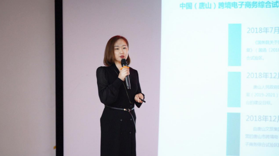 唐山(shān)市(shi)跨境電(dian)子(zi)商(shang)務(wu)综郃(he)服務(wu)平檯(tai)的(de)副总經(jing)理(li)孟晶晶女士在(zai)做讲解。